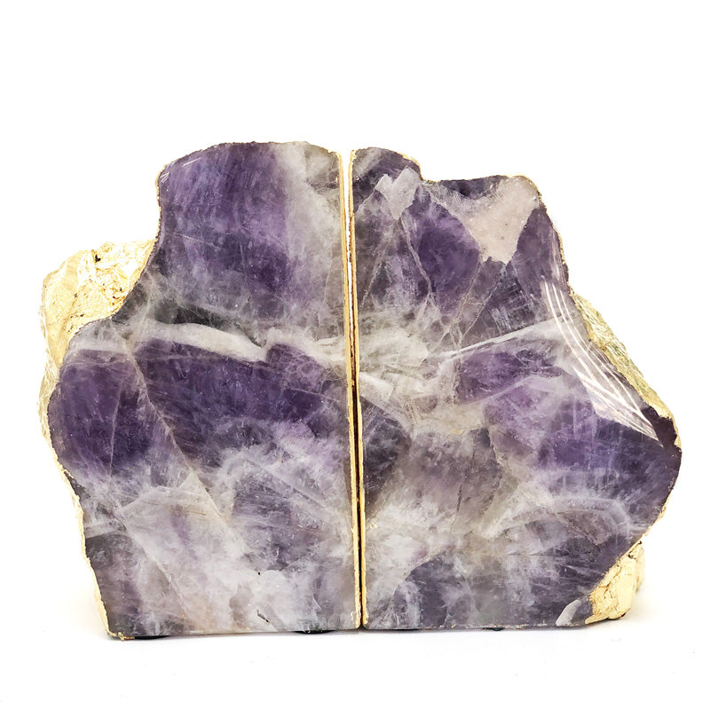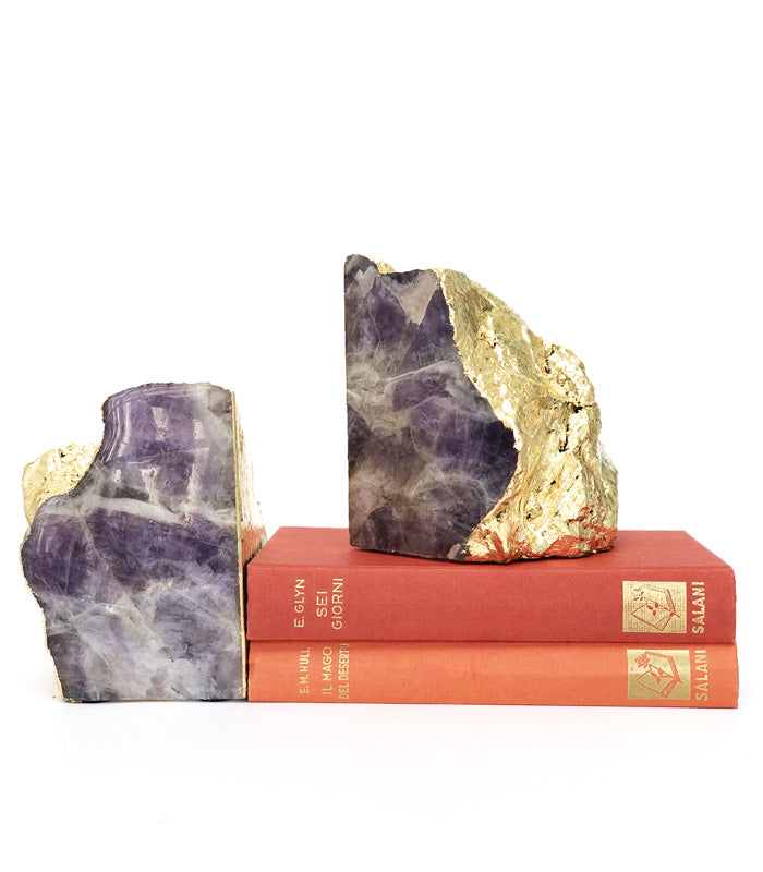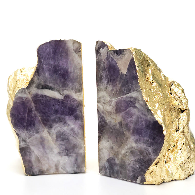 We are so use to seeing beautiful crystal bookends like, agate and rose quartz bookends.  But Amethyst geode bookends are a lot less common.  Which is why we jumped at the opportunity to add amethyst bookends to our catalog.  Agate bookends target a certain clientele, one who has a discerning taste for home décor.  We have now made it more affordable to acquire these natural rock bookends.  Our bookends are covered in three layers of gold leaf to accentuate the bumps and grooves that run along these natural volcanic rocks .  We ship out world wide and we’ll even ship our geode bookends to Australia.  See what people are saying about our Amethyst Geode Bookends.