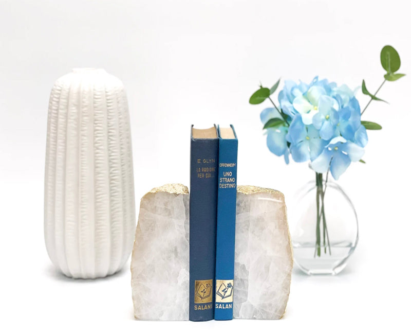 White Quartz and Geode décor have taken the design world by storm.  Our beautiful white quartz bookends will make you stop and gasp where ever you place them.  We cover our bookends in multiple layers of gold leaf which enhances its natural beauty.  Our bookends are not a dyed quartz geode, these are natural quartz.   Quartz and Geode are becoming commonplace in home décor but we strive to elevate these rough-hewn stones into elegant purposeful décor.