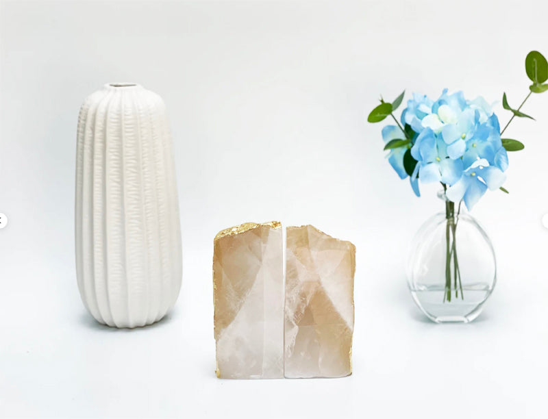 White Quartz and Geode décor have taken the design world by storm. Our beautiful white quartz bookends will make you stop and gasp where ever you place them. We cover our bookends in multiple layers of gold leaf which enhances its natural beauty. Our bookends are not a dyed quartz geodes, these are natural quartz. Quartz and Geode are becoming commonplace in home décor but we strive to elevate these rough-hewn stones into elegant purposeful décor.
