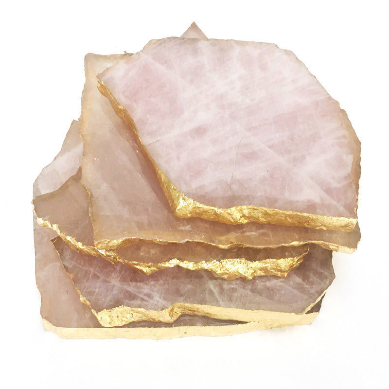 Rose quartz coasters have an understated elegance. The rose quartz coasters with gold leaf edge increase the luxury and make an eye-catching addition to the table. The rose quartz coasters with gold leaf edge are carefully gilded and then sealed, so the finished coaster is as durable as the quartz itself. The rose quartz coasters will be a centerpiece of your home or office decor for years to come.
