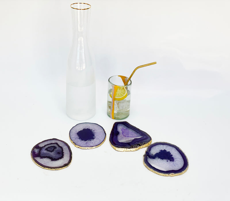 This beautiful Blue Agate Coaster set is covered in gold leaf. Each agate coaster is between 4" to 5.5"inches in size.