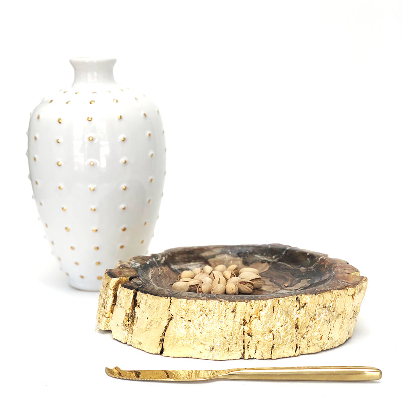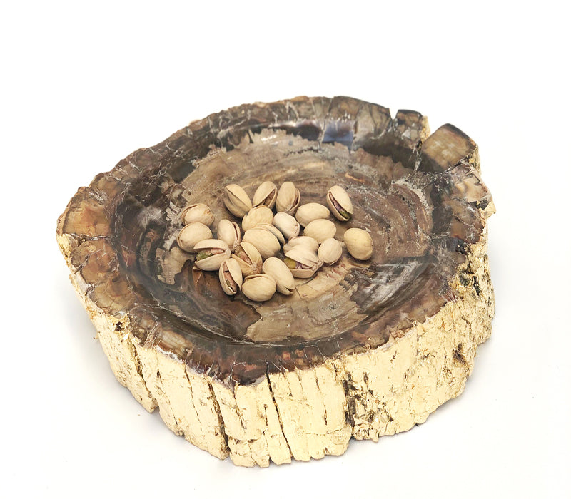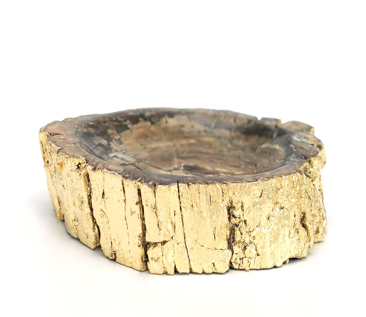 Petrified Wood Bowls and dishes are great for weddings, engagements, housewarmings and even Mother’s Day gifts. Why not wow someone with this amazing petrified wood bowl or, better yet keep it for yourself. Our dish is a slice of silicified wood covered in three layers of gold leaf. The beauty of petrified wood is its smooth glass like finish.